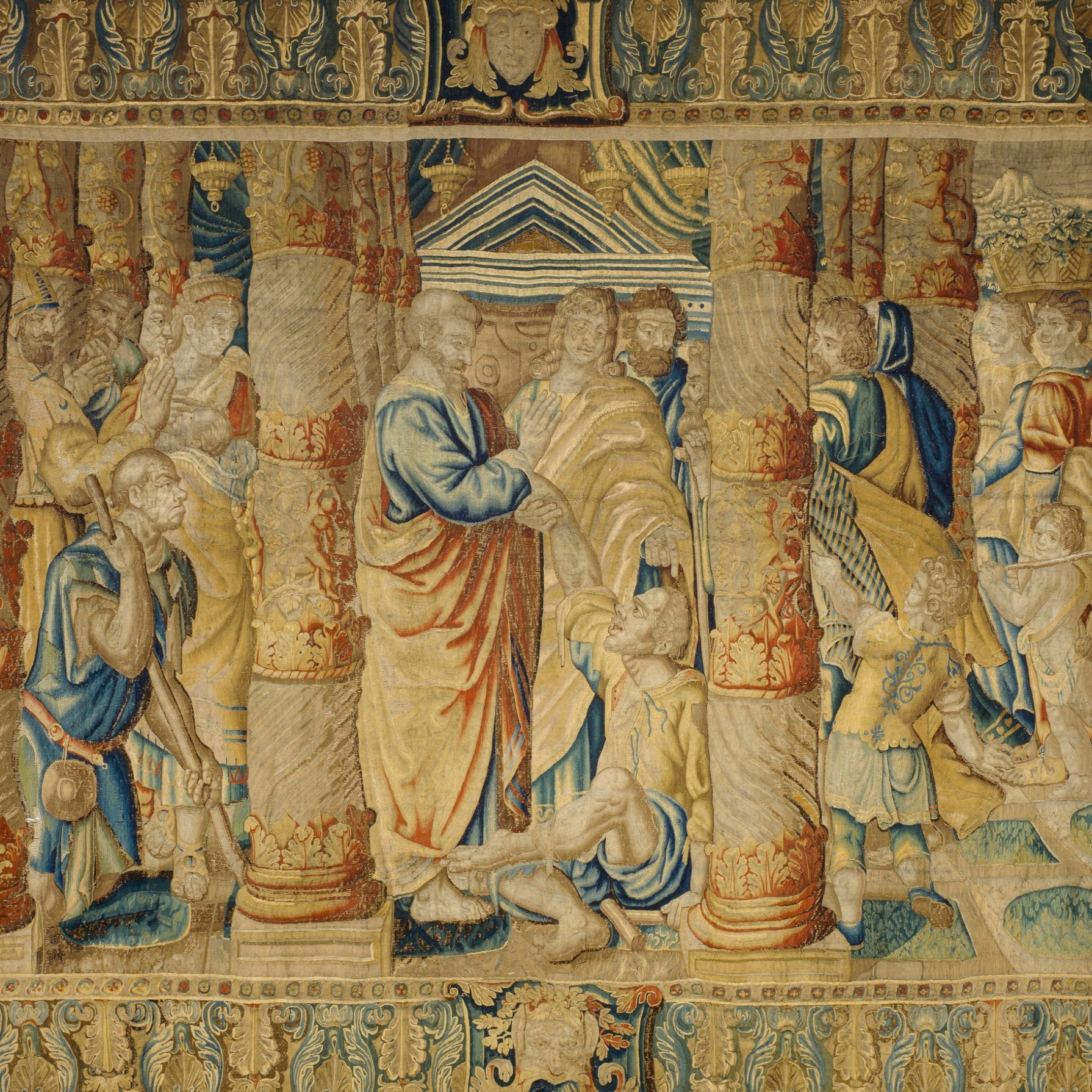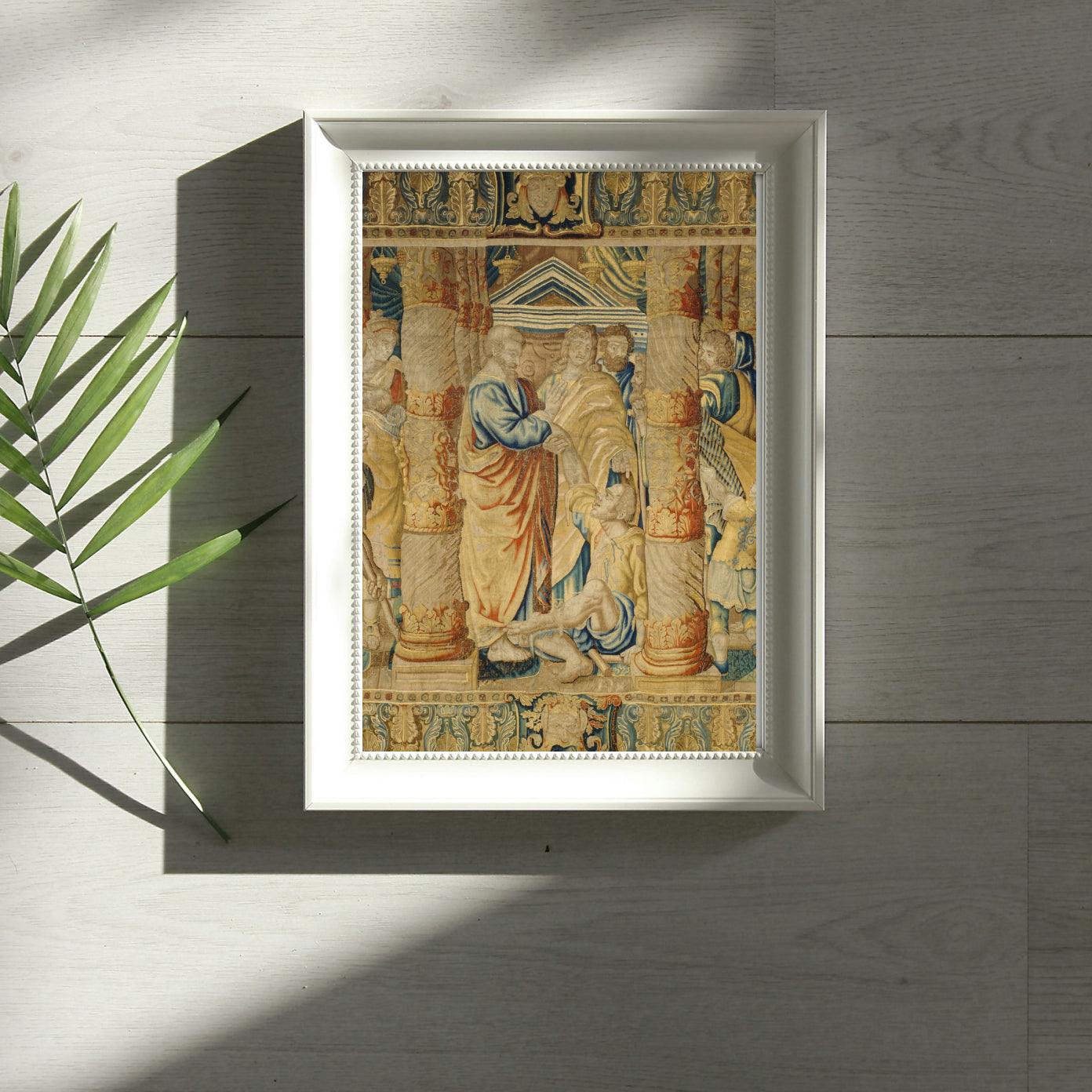 The tapestry likely emphasizes the vivid colors and intricate details characteristic of such works, showcasing the architectural grandeur of the Temple's gate and the bustling atmosphere of Jerusalem's ancient streets. Peter and John, depicted with solemnity and compassion, are shown in a moment of profound interaction with the beggar. According to the biblical account, Peter declares, "Silver and gold I do not have, but what I do have I give you: In the name of Jesus Christ of Nazareth, rise up and walk." Miraculously, the beggar is healed and leaps to his feet, praising God amidst the astonishment of onlookers.